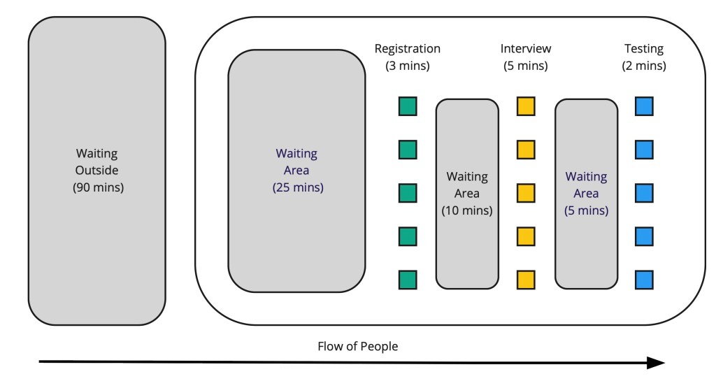 “But life’s not that simple!”, I can hear you objecting already. And, yes, it’s true, life’s not that perfectly neat and tidy. You can’t easily divide up an employee’s labour into halves. It takes time for patients to physically move from one step to the next. The skillset required to do registration (data entry) is different from that required to do interviews, which is different again from that of administering the test. All of these reasons and more for why it potentially “won’t work” are perfectly welcome.
