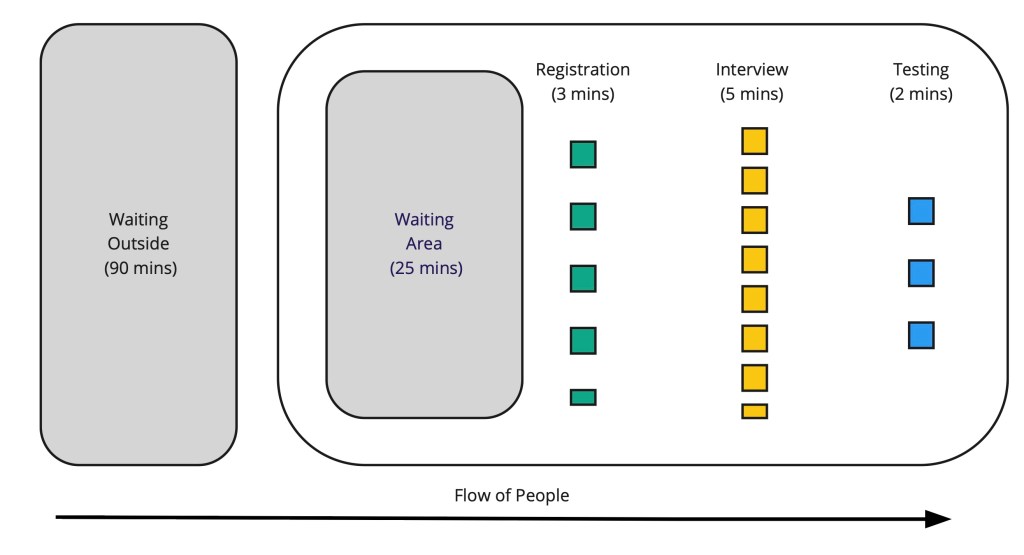 Now we’ve got 4 people in registration, 8 in interviewing, and 3 in testing. Further, the workers in registration and interviewing will be arranged in clusters (you can call them “cells” or “pods” if it sounds better) of 3 people, all 6 feet apart, of course, and the registration process will feed the interviewing process. The patient will only move forward from registration when one of the two interviewers is free. Similarly, patients can only move forward from interviews to testing once one of the three testing stations is free.
